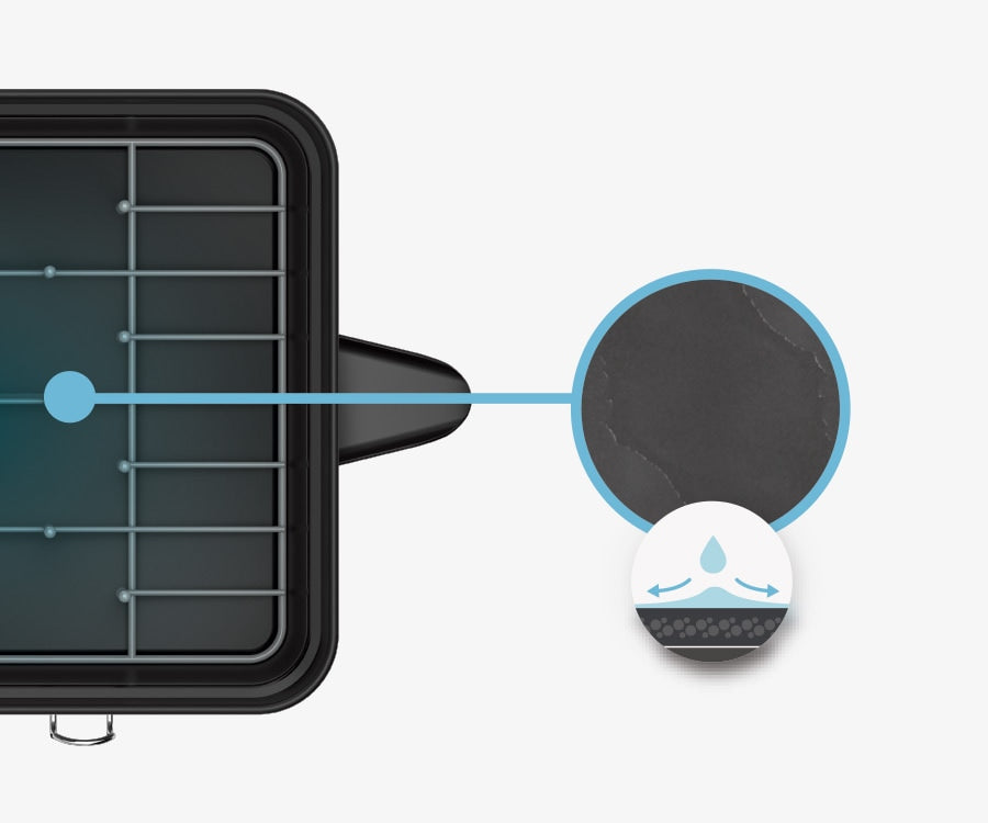 The inner plastic tray is designed for optimum draining with a hydrophilic coating that spreads water thinly across the surface for super-fast evaporation plus a central stainless steel drain that takes care of the rest — and it unscrews for easy cleaning!