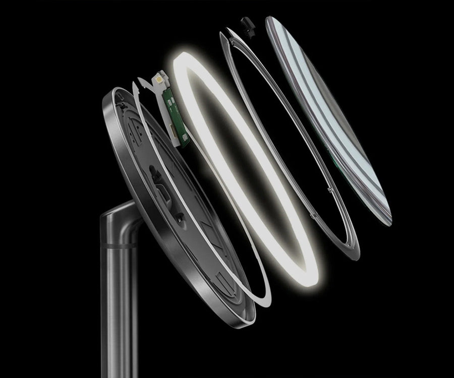 Inside the mirror's light ring, specially patterned micro-reflectors disperse light evenly — no light loss or hot spots — while the surgical-grade LEDs provide the full color spectrum to show every detail, every nuance.