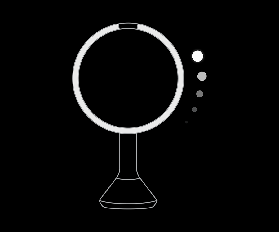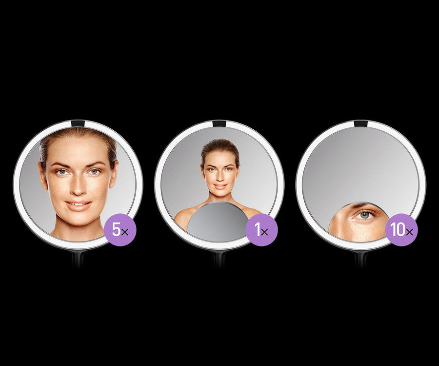 On one side, 5x magnification allows you to view your entire face with enhanced clarity and detail. On the other, 1x is ideal for checking your look at true size, and the 10x window is perfect for an extremely close-up detailed view.