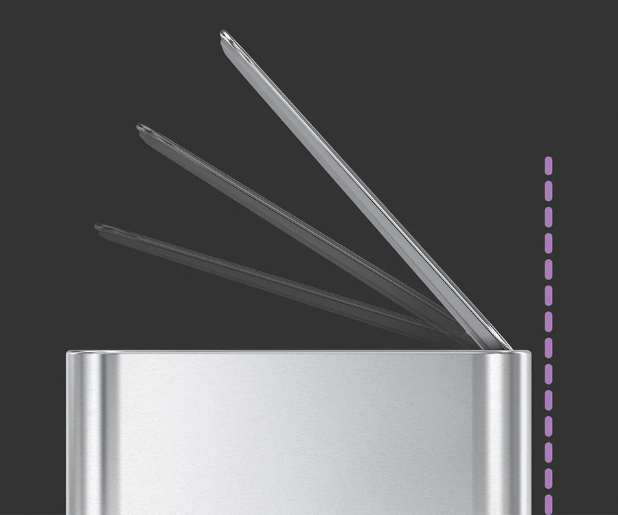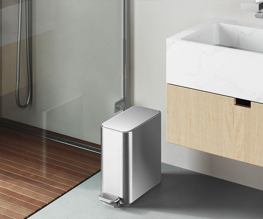 A space-efficient small can with big can features and quality. The slim design gives you generous capacity but fits in a tight spot, and the sleek internal hinge allows you to put it flush against the wall.